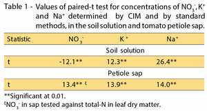 Tomato was cultivated in a greenhouse in Piracicaba, SP, Brazil with different levels of nitrogen (N), potassium (K) and salinity in the irrigation water. Fertilizers and salts used were ammonium nitrate (NH4NO3), potassium chloride (KCl), calcium chloride (CaCl2), and sodium chloride (NaCl), which were applied by drip fertigation. Soil solution samples were collected every 15 days (on average) beginning 24 hrs after irrigations by suction at the 15 cm depth with porous ceramic cups and the concentrations of nitrate (NO3-), potassium (K+), and sodium (Na+) ions were determined by Cardy ion meters. The results were compared with those determined in laboratory by standard methods – flame photometry for K+ and Na+ and steam-distillation for NO3- .