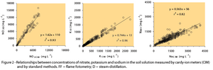 Concentrations of NO3-, K+, and Na+ in soil solution determined by Cardy ion meters and by standard methods in laboratory were found strongly correlated (Figure 2). The NO3- concentrations measured by Cardy ion meters were about 39% lower than those determined by distillation method, while the K+ and Na+ concentrations were 21% and 67% higher, respectively, than those determined by flame photometry. The coefficients of determination (r2) were high for all ions and the relationships were significant at 1% (Table 1).