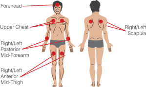 1. After the onset of exercise or training (~10 mins), clean the following athlete’s anatomical skin sites with alcohol wipe or deionized / distilled water rinse and dry with sterile gauze or towel: right anterior mid thigh, right posterior mid forearm, left posterior mid forearm, upper chest, right scapula, left scapula, and forehead.