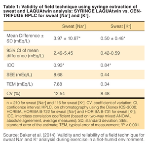 Baker et al. (2014) conducted a study comparing a field versus reference laboratory method for extracting (syringe vs. centrifuge) and analysing sweat [Na+] and [K+] (LAQUAtwin vs. HPLC) collected with regional absorbent patches during exercise in a hot-humid environment. They found that the sweat [Na+] and [K+] obtained with the syringe-LAQUAtwin field method were significantly correlated to those of centrifuge-HPLC laboratory method (See Table 1 for the results). The LAQUAtwin Na-11 and K-11 pocket meters (superseded the B-722 and B-731 models used in the study) have been proven practical and useful tools in delivering rapid, cost-effective, and highly reliable measurements of athletes’ sweat [Na+] and [K+], respectively, in field studies.