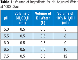 Tables 1 and 2 show the ingredients for pH-adjusted waters at 1000µS/cm and 6000µS/cm, respectively. If solutions in these tables will be prepared, follow the indicated volumes of acetic acid, DI water, and ammonium hydroxide for steps 1 and 2.
