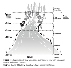 Salinity is an important measurement in seawater or in estuaries where freshwater from rivers or streams mixes with salty ocean water since aquatic organisms have varying abilities to survive and thrive at different salinity levels. Saltwater organisms survive in salinity levels up to 40 ppt, yet many freshwater organisms cannot live in salinity levels above 1 ppt.2