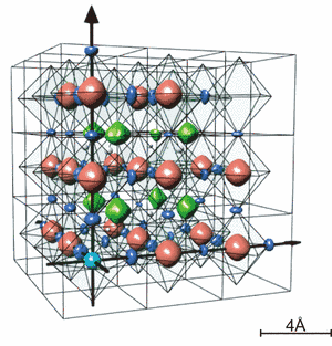 3D images of SrTiO3 reconstructed from the holograms. Green, red, and blue objects correspond to Sr, Ti, and O atoms, respectively.