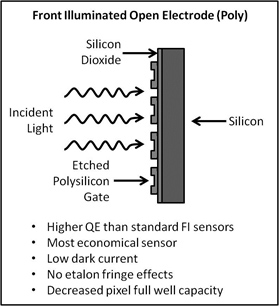 There are two main types of CCD sensors; front illuminated (FI) and back illuminated (BI). In a front illuminated sensor, the incident light must pass through the silicon gate before reaching the active silicon, generally leading to lower quantum efficiency. Response is typically low in the near-IR and UV, however lumogen coatings may be added to FI sensors to enhance UV response. To increase quantum efficiency in FI sensors, the polysilicon gate may be etched out to allow the light to pass more easily into the silicon layer. This type of sensor is often referred to as open electrode (OE) or open poly.