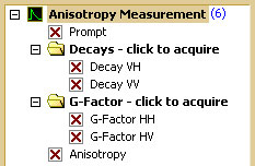 Impulse reconvolution of up to 2 correlation times and 5 fluorescence decay components. Each model parameter, including shift, can be fixed at a pre-determined value or optimised as part of the parameter fitting. The use of reconvolution allows accurate determination of decay times and rotational correlation times even when the observed decay is grossly distorted by the duration of the excitation pulse.