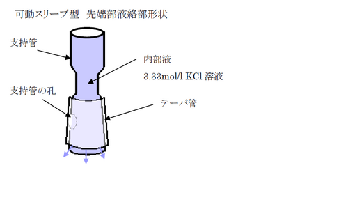 液絡部は支持管の先端にガラス製のテーパ管をはめ込んだガラス管同士の摺り合せ構造となっています。支持管の孔から流出する内部液がガラスの合わせ目全体から流出するため、抵抗が小さく一般的には液間電位差が小さく安定な電位が得られます。このため低導電率水や非水溶媒などの測定に適しています。また、液絡部の目詰まりも起こりにくいので、高粘性溶液のサンプル測定にも適しています。一方外側のテーパ管部が上下に可動するので、摺り合せがゆるいと内部液流出量が多くなり、試料を汚染される可能性がありますので、測定時には常に摺り合せ部分は締めておく必要があります。