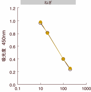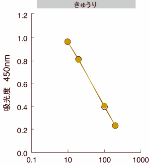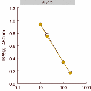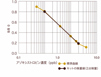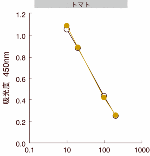 図は、アゾキシストロビンを添加した各農産物のメタノール抽出液(10%メタノール相当に希釈)を用いて反応曲線を描き、10%メタノール標準曲線と比較したものです。両者が一致していると、その農産物抽出液の影響なくアゾキシストロビンを測定可能といえます。