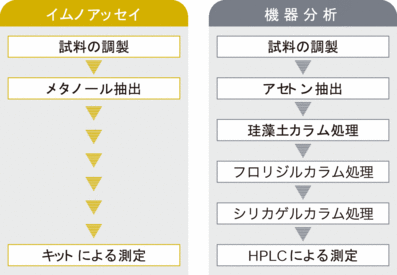 機器分析は高精度な測定法ですが、下記の前処理や装置のオペレーションに高い技術と時間、また有機溶媒としてアセトン、ヘキサン、酢酸エチルなどが必要です。本キットは前処理が簡便で時間も大幅に短縮でき、抽出溶媒も少量のメタノールのみを使用するだけでアゾキシストロビンを測定することが可能です。
