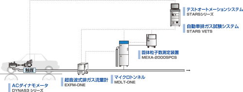 エンジン排ガスの一部を、もとの排ガス流量と採取排ガス流量との比率が常に一定になるように採取し、空気により一定流量に希釈する、分流希釈方式を採用。本方式により、最新規制の測定法に対応しながら、小型の希釈トンネルシステムを実現しました。