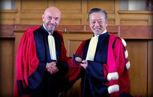 7月10日にモンペリエ大学にて開催された授与式では、モンペリエ大学学長のPhilippe Auge(フィリップ・オジェ)氏より名誉博士の証であるメダルと懸章が授与されました。