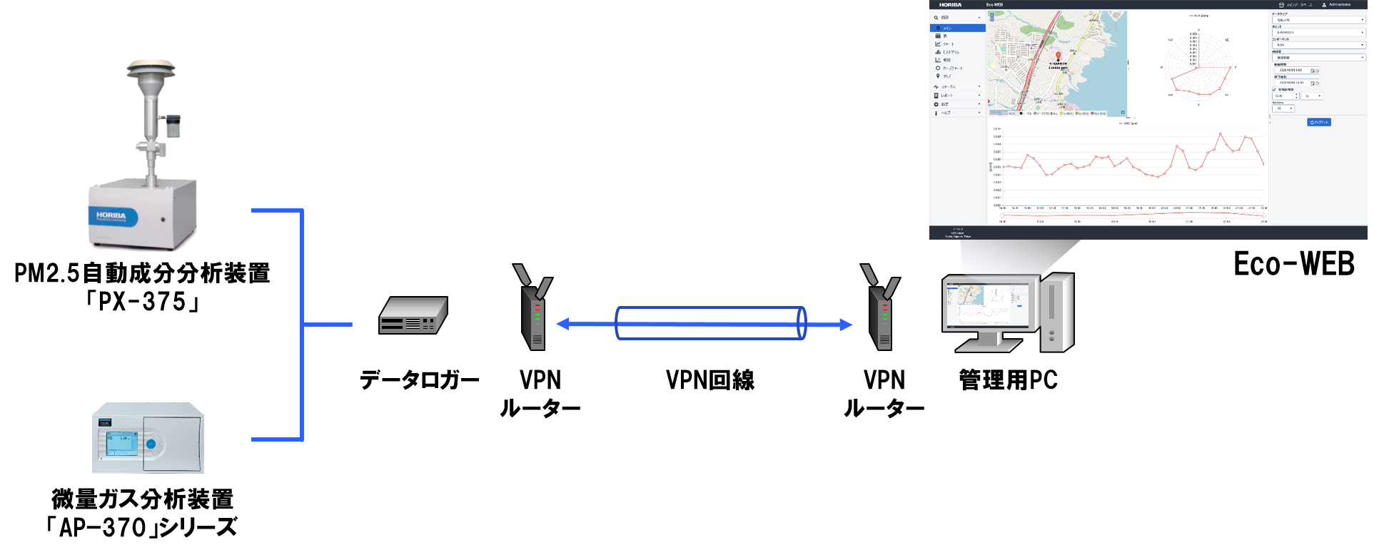 今回、計測展2020で初出展する「Eco-WEB」は、現場で1時間毎にPM2.5の成分分析が可能な当社のPM2.5自動成分分析装置「PX-375」と、大気中の硫黄酸化物や窒素酸化物などを測定する「AP-370」、風向風速計から得られるデータをリモートで収集し、“PM2.5の質量の変化“と”PM2.5に含まれる成分の濃度変化“や”硫黄酸化物濃度の変化“などを比較し、成分毎にどの方角から飛来する量が多いかを可視化することで、発生源の解析ができます。