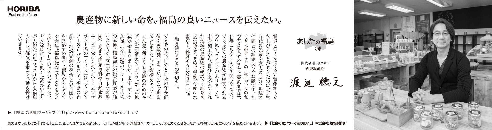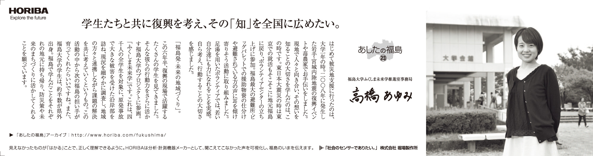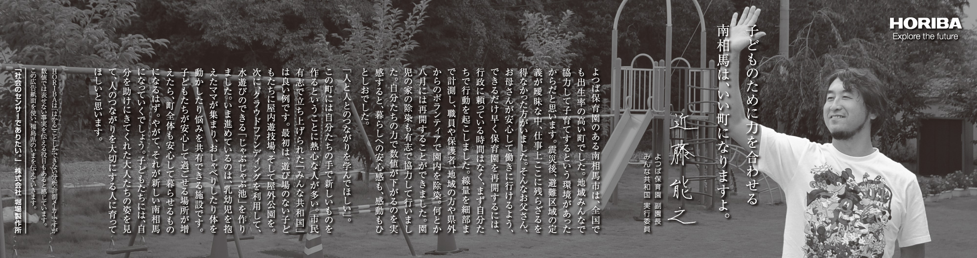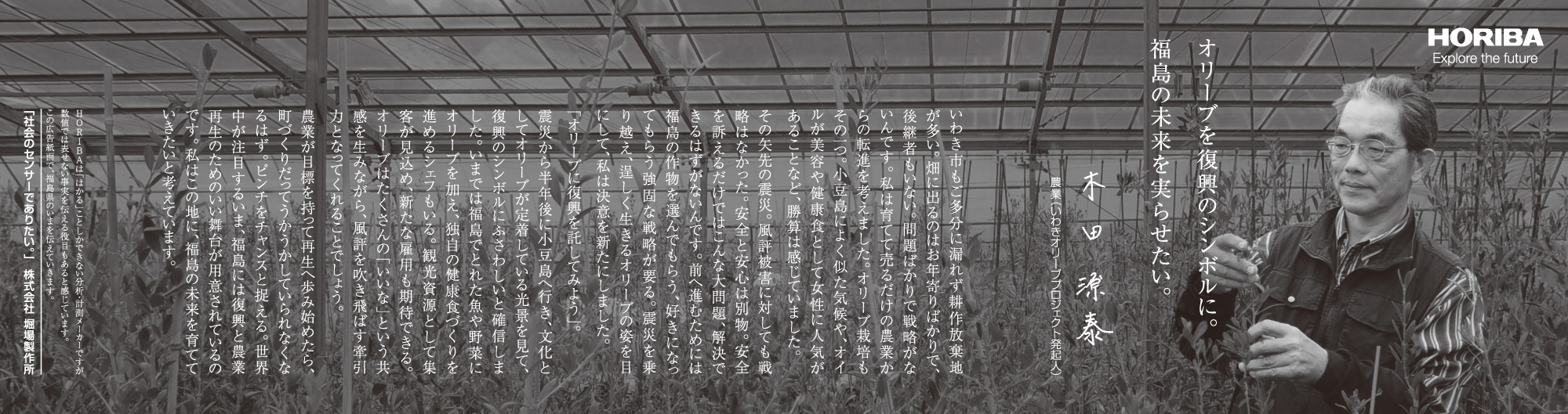 最近は、東日本大震災関連のニュースも以前ほどには報じられなくなりましたが、現在も仮設住宅での生活を余儀なくされている人たちも少なくないなど、震災前の平穏な生活を取り戻すには至っていません。震災被害の風化を危惧する声が出ている一方で、復旧復興のため、そして日本のこれからのために私たちに何ができるのか。HORIBAは分析・計測という事業を通じて数値という事実を提供し、また、いま福島県で起きている事実を社会に発信していきます。