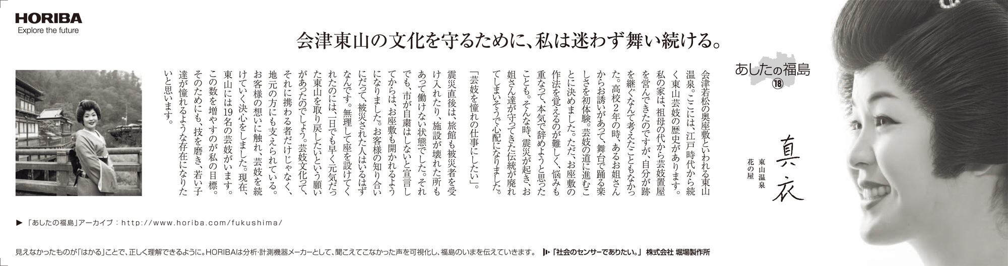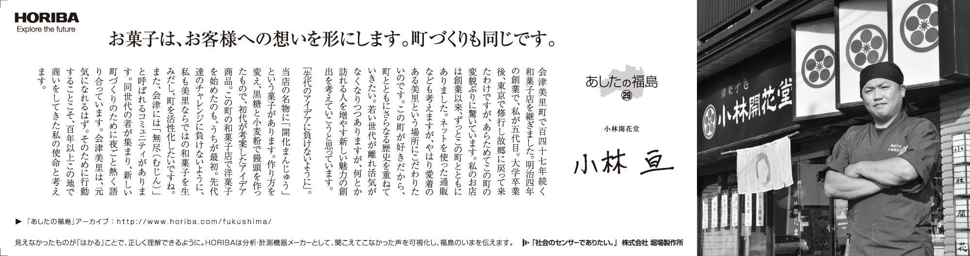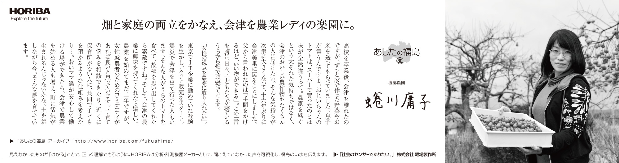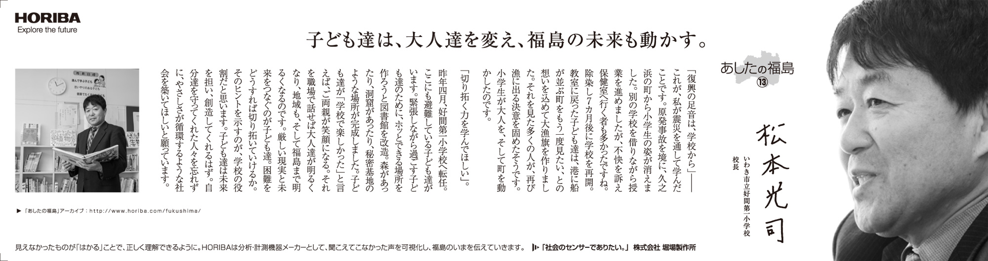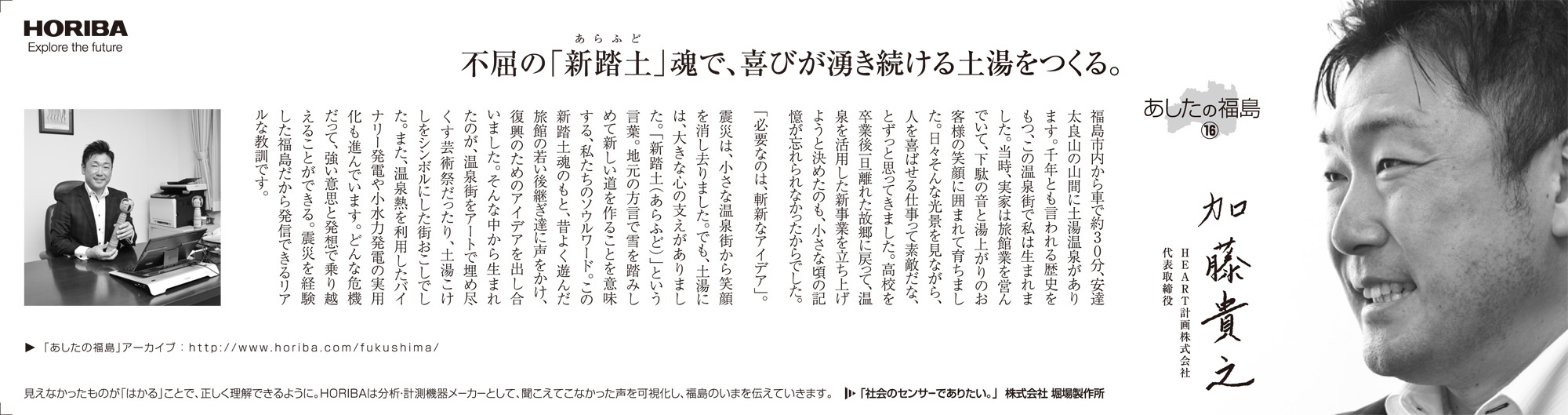 最近は、東日本大震災関連のニュースも以前ほどには報じられなくなりましたが、現在も仮設住宅での生活を余儀なくされている人たちも少なくないなど、震災前の平穏な生活を取り戻すには至っていません。震災被害の風化を危惧する声が出ている一方で、復旧復興のため、そして日本のこれからのために私たちに何ができるのか。HORIBAは分析・計測という事業を通じて数値という事実を提供し、また、いま福島県で起きている事実を社会に発信していきます。