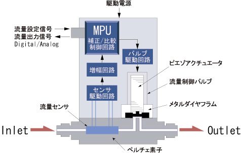 マスフローコントローラ:LV-Fシリーズは、マスフローメータ:LF-Fシリーズにピエゾアクチュエータバルブを加え、比較制御回路を内蔵した液体用マスフローコントローラです。流量設定信号と流量出力信号を比較し、両信号が一致するようにバルブの開度を自動的に制御します。フィードバック制御のため、外的条件の変化に対する流量変化がなく、精度良く安定な制御が可能です。コントロールバルブにはピエゾアクチュエータバルブを使用し、安定性にすぐれ発熱もなく、低沸点の液体の流量制御にも最適です。