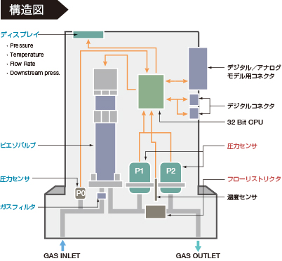 差圧検出方式を採用した最先端プロセス向け高性能マスフローモジュール。PI機能、マルチガス・マルチレンジ・マルチプレッシャー機能、自己診断機能を備え、±1% S.P. の高精度と応答速度0.8秒を実現しています。