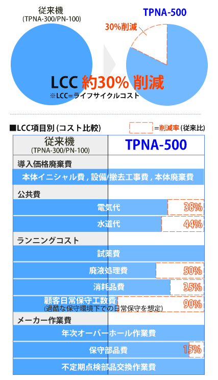 ※1_Life Cycle Cost (LCC):製品購入から製品廃棄までに必要な全費用。製品費、設置工事費、公共費(電気代、水道代)、ランニング費(試薬代、廃液処理費、部品代、工数)、メンテナンス費(定期オーバーホール代、不定期工数)、撤去工事費、廃棄費などの総額