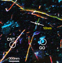 このイメージにおいて見積もられるカーボンナノチューブ直径は10 nmであった。すなわち、本カーボンナノチューブ測定において、10 nm径のカーボンナノチューブを検出可能と言える。以上の結果は、金基板上のナノチューブ及びグラフェン構造を、短時間でしかもナノメートルスケールで分類できることを示している。