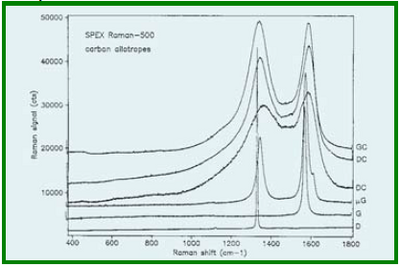 「ガラス状炭素(GC)」と呼ばれる材料はDバンドとGバンドのピークが鋭く、その強度比は、他のカーボン材料で得られる強度比の逆になります。この材料は高結晶性であるにもかかわらず、結晶領域の大きさが非常に小さいことが特徴です。ガラス状炭素のスペクトルをFigure1に示しています。DバンドとGバンドの強度比(D/G比)は励起波長に依存します。GC中の、各グラファイト構造が持つ電子遷移エネルギーの違いにより、D/G比が励起波長に対して変化します。Yoshikawa et al.(Appl. Phys. Lett., 52, 1639-1641, 1988)は458-647 nmのレーザー波長で取得した、0%および30%の水素を含有する膜のスペクトルを示しています。いずれの種類の膜も、赤色レーザーで励起したときにGバンドの強度がDバンドのそれよりも強くなっていることがわかります。いずれの波長においても、Dバンドは、30%の水素を含有する膜のスペクトルよりも純粋な炭素膜のスペクトルにおいて強くなります。
