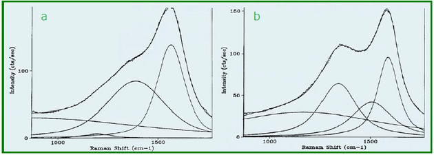 さらに、Dバンドは励起波長によってシフトし、長波長の励起レーザーでは低波数側に現れます(Wang, Alsmeyer, and McCreery, Raman Spectroscopy of Carbon Materials: Structural Basis of Observed Spectra, Chemistry of Materials 2, 557-563(1990))。その相対強度は単位格子の秩序性によって決まるだけでなく、こうしたピークの半値幅の変動によっても評価することができます。近年では、バンドフィッティングアルゴリズムを用いて各成分の分離ができ(LabSpecおよびDiskSpecソフトウェア、 Horiba France)これらのバンドの積分強度比を秩序性評価の指標に用いることが、適切であると考えられています。