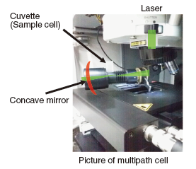 液体試料は,透明で,十分な量がある場合,1 cm角セルが使用できるマルチパスセル(Figure 4:液体測定用ユニット)を使う。少量,高粘性,色が付いている液体はスライドガラスに1滴分取してそのまま測定する。カバーガラスを使いレンズへの液体の付着を避けるとよい。蒸発しやすい試料は,小さなカップに入れ,カバーガラスで蓋をして測定する。ガラス容器ごと測定したい場合,レーザ90°曲げユニット(Figure 5)を用いて,ステージ上に載せた容器の横からレーザを照射し測定する。