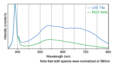 and Green lines are by UVI 74x objective and NUV objective lens, respectively. The spectra were normalized at 380nm peaks.