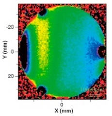 右の試料の観察像中の四角で囲まれた部分をマッピング測定しました。左の図は、試料の測定部位内のピークのシフト量を示しています。左の図のようにマッピングすることで、試料にどのように応力が作用しているかを見積もることができます。