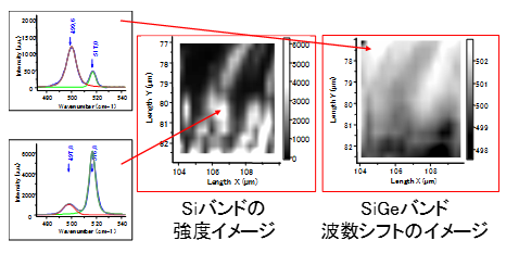 例2: ラマンマッピングによるシリコン(Si)層とシリコンゲルマ(SiGe)層の間に生じた応力のモニター