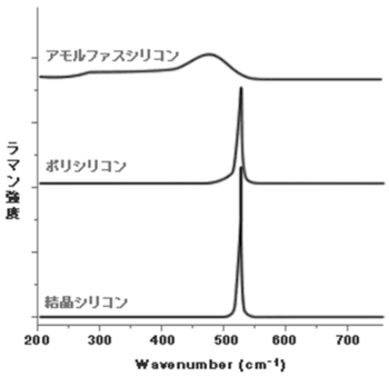 結晶性の解析は重要なラマンアプリケーションの一つで、シリコンの場合、結晶シリコン、ポリシリコン、アモルファスシリコンの評価に用いられます。下のスペクトルは、シリコンの結晶性の違いによるラマンスペクトルの波形の違いを示しています。