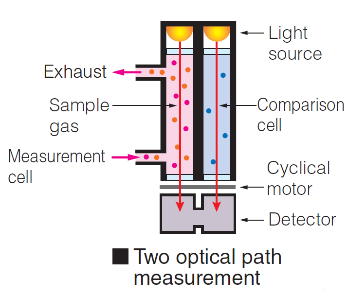 The sample gas and reference gas are each put in different cell for measurement.