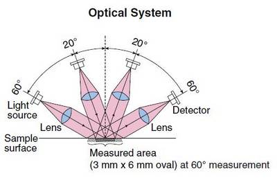 Optical system | 60° measurement: Incident angle 60°, Reception angle 60°. |
