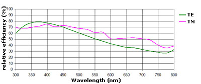 These efficiency curves are absolute theoretical efficiencies, calculated using rigorous electromagnetic theory, taking into account the true groove profiles of manufactured gratings measured with an atomic force microscope (AFM).
