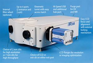 The iHR series spectrometers are fully automated; all motors are computer controlled including slits, gratings, turret rotation, and swing mirrors. There are four optional ports, two entrance and two exit, that can be utilized in any combination of two inputs and two outputs. The two optional output ports can be configured with either slits or array flanges for use with multichannel detectors.