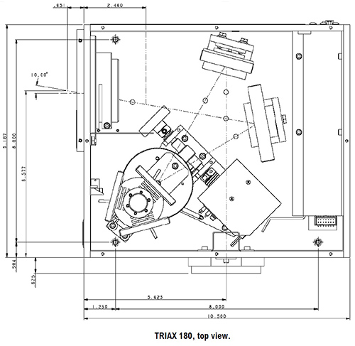 The fixed slit assembly can hold different slit inserts ranging in physical size from 0.025 to 2 mm, and for the 1200 g/mm grating the reciprocal linear dispersion of the Triax is 3.53 nm/mm.