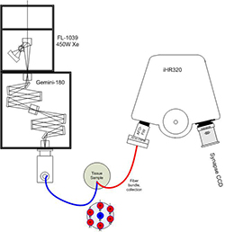Optical spectroscopy can be used to differentiate between healthy tissue and benign tissue. This is particularly important for intra-operative diagnostics to locate small regions of cancer within normal tissue. Specifically, diffuse reflectance spectroscopy has been used to characterize both benign and malignant breast tissue ex situ. In this setup, a light source and dual grating monochromator produce tunable light which is coupled to a fiber bundle and introduced to the tissue under study. Another set of fibers then collect the signal and couple it to a spectrograph and detector for analysis.