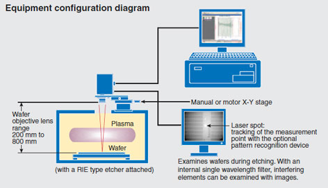The system consists of a compact interference measurement section that includes the laser source, light receiver, and optical components, as well as the illumination and CCD imaging camera, allowing monitoring of any area of the wafer surface using microscopic images. This system uses a visible laser (670 nm) which can be used for a broad range of films.